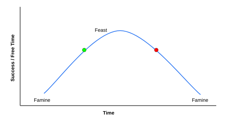 This graph displays a cycle of Feast and Famine. The blue line represents material success and the amount of free time and energy people have. The green and red dots have the same amount of free time and energy.